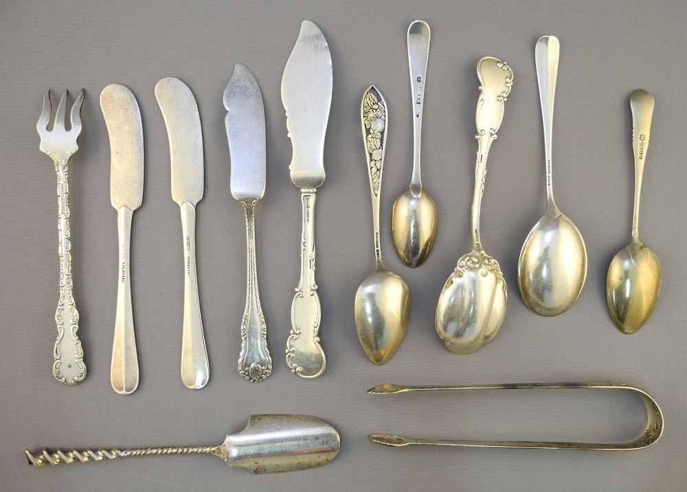LOT 270 Cloth Pouch of Sterling Silver Tongs Teaspoons, Spreaders, Scoop & Pickle Fork, TW:298 Grams. Estimate: $150 - $200 Sold For: $160 Auction Date: Tuesday, February 21 2023 at 4:00 PM