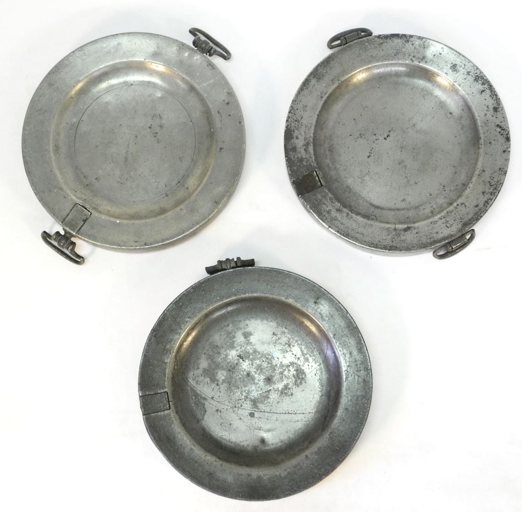 3 Pewter Warming Dishes & A Glass Cauldron, 13"H.