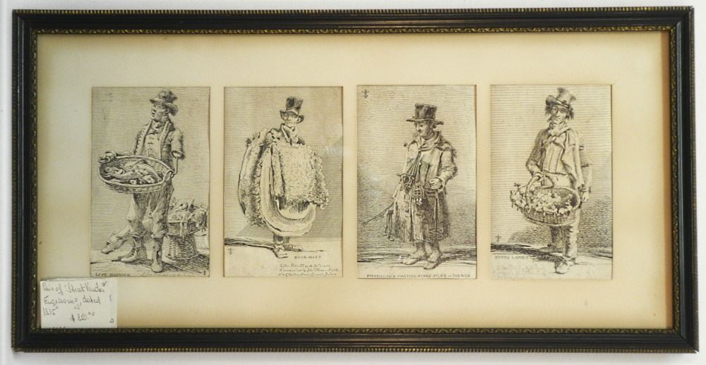 2 Framed Sets of Four Etchings, "London Vendors" 7 1/4"X18".