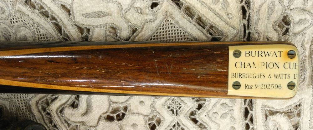 LOT 89 "Burwat Champion" Billiard Cue, "Burroughs & Watts Ltd." with Original Japanned Case 57 Estimate: $150 - $200 Sold For: $140 Auction Date: Tuesday, February 21 2023 at 4:00 PM