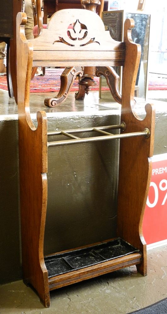 LOT 50 Art Nouveau Influenced Oak & Brass Cane / Umbrella Stand, 48 1/2"H. Estimate: $150 - $200 Sold For: $90 Auction Date: Tuesday, February 21 2023 at 4:00 PM