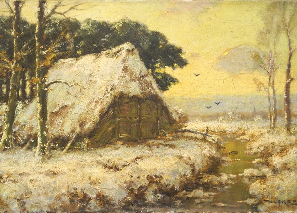 Oil on Canvas Signed Nefrens, 15 7/8" x 24", "Creekside Farmhouse in Winter".