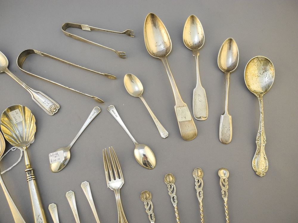 LOT 277 Collection of Silver Spoons & Sugar Tongs, TW 449gr. Estimate: $100 - $200 Sold For: $275 Auction Date: Tuesday, February 21 2023 at 4:00 PM