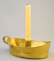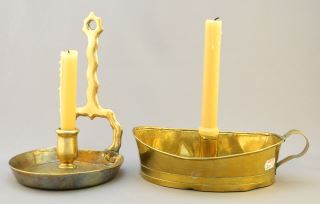 LOT 8 2 Antique Brass Chambersticks: Boat Shaped (8 1/2"L) Wall Hanging 8" High Estimate: $60 - $100 Auction Date: Tuesday, April 18 2023 at 4:00 PM