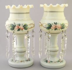 LOT 213 Pair of Victorian Enameled Glass Lustres, 9 1/8"H. Estimate: $50 - $60 Auction Date: Tuesday, August 15 2023 at 4:00 PM