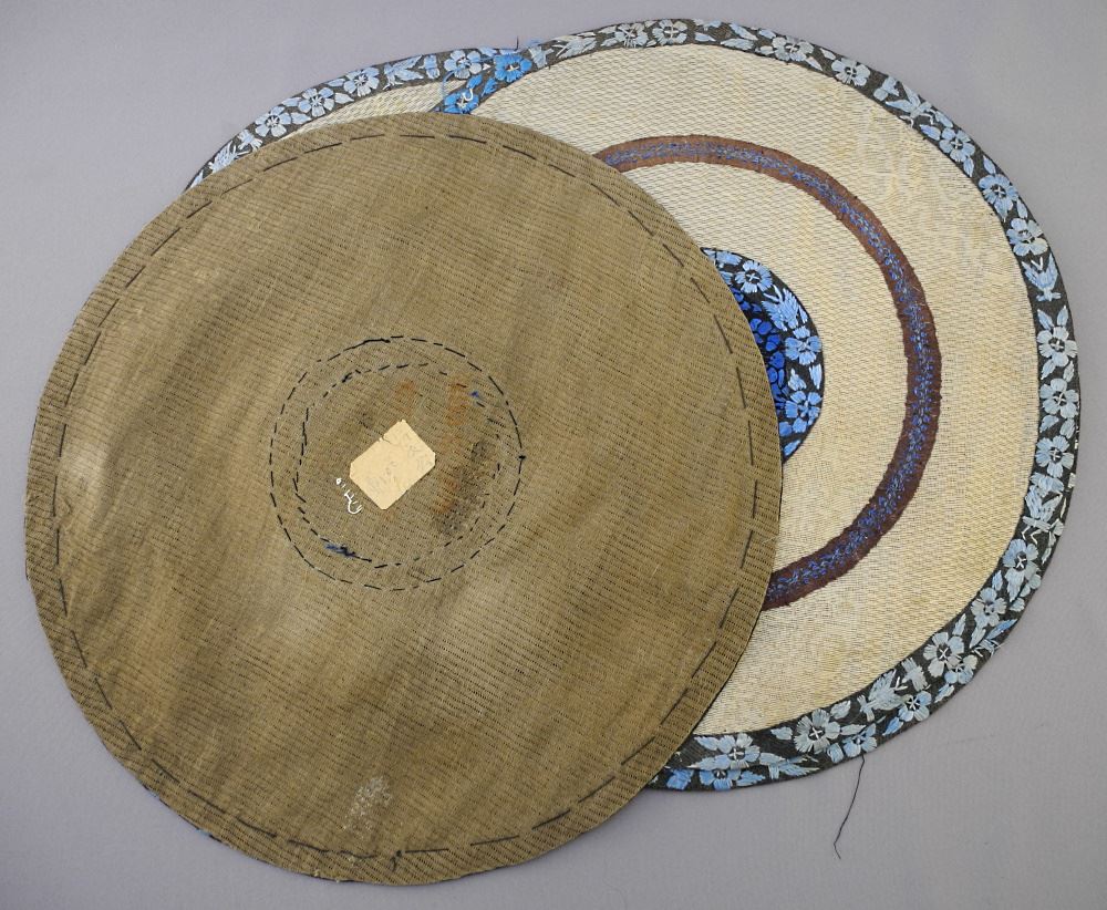 15 Chinese Silk Place Mats, 11 7/8" Diameter, as found.