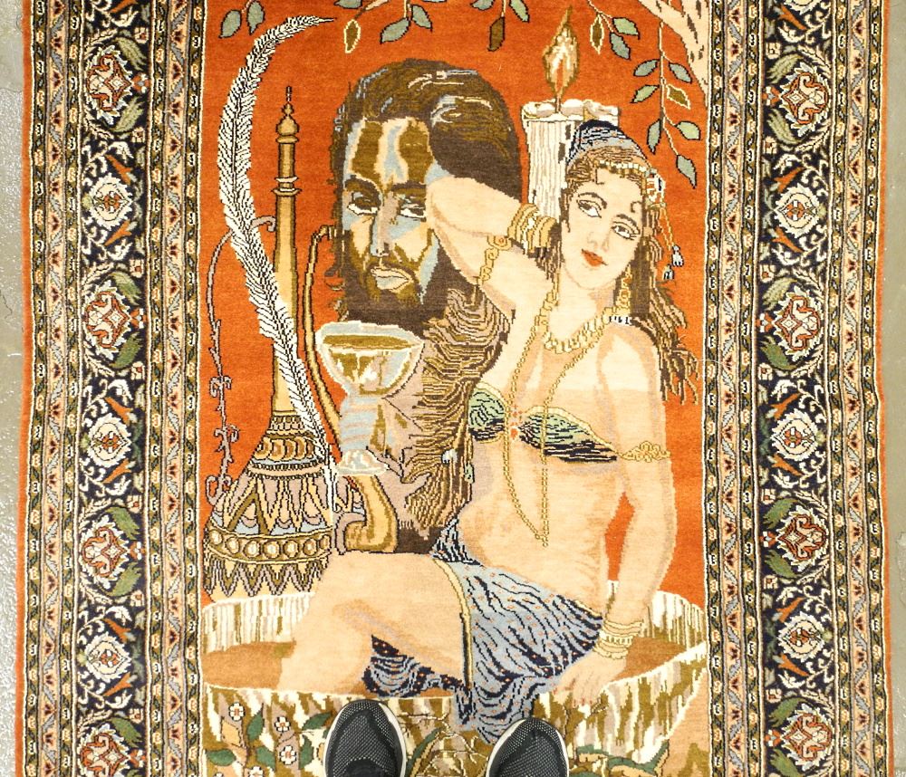 Indo Persian Omar Khayyam Subject Hand Knotted Wool & Cotton Blend Carpet, approx. 7'2" x 4'.