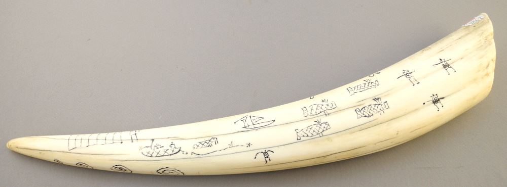 LOT 69 Scrimshaw Walrus Tusk, 17 1/4". Estimate: $150 - $300 Auction Date: Tuesday, August 15 2023 at 4:00 PM