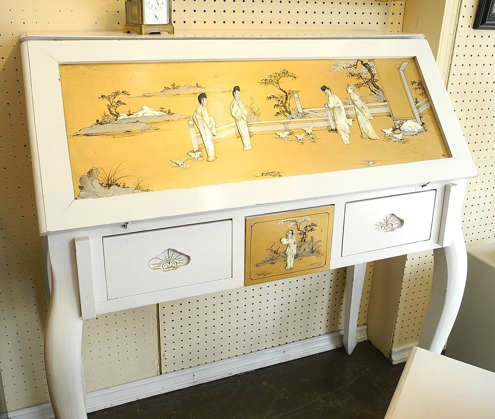 LOT 21 White Painted Chinoiserie Bureau Inset with Mother of Pearl With Chair. Estimate: $100 - $150 Auction Date: Tuesday, August 15 2023 at 4:00 PM