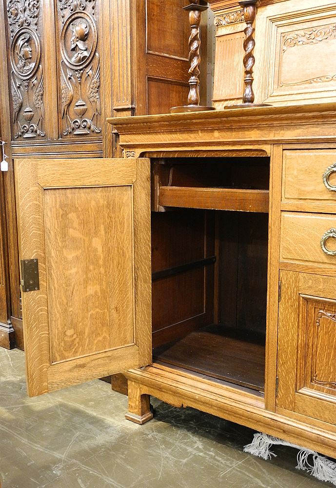 Carved Oak Sideboard with inset Bullseye Mirror, 72"W.
