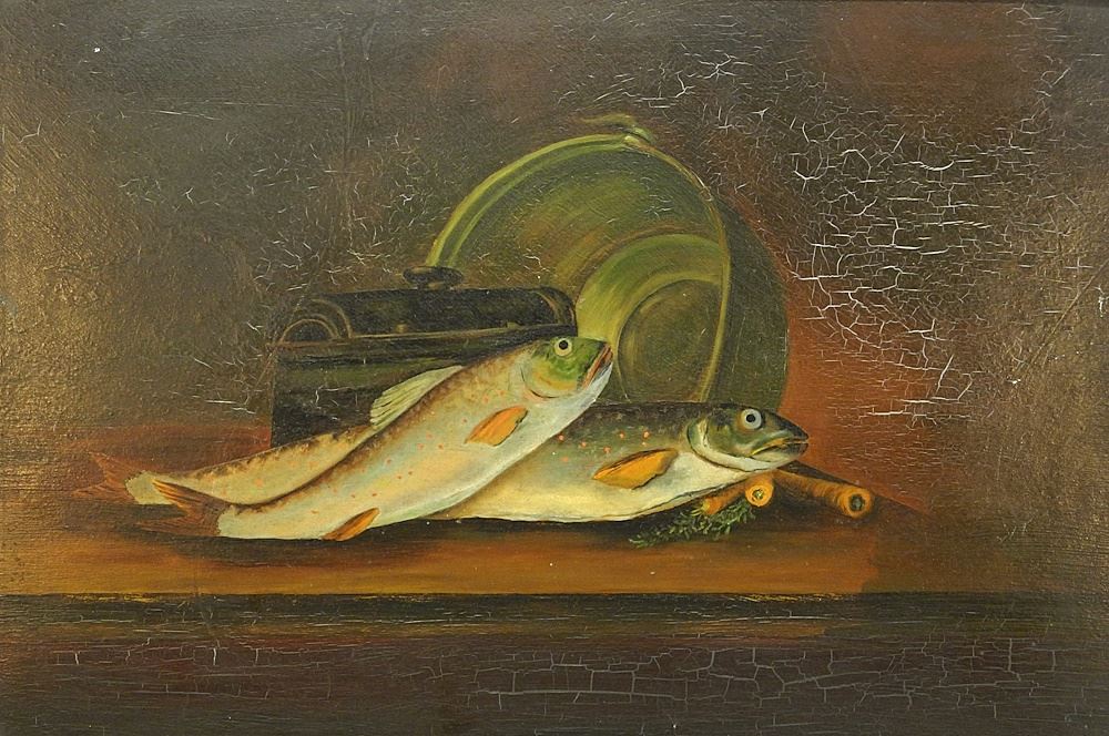 Unsigned Naive Oil on Board, 15" x 22 1/2", "Still Life with Trout".