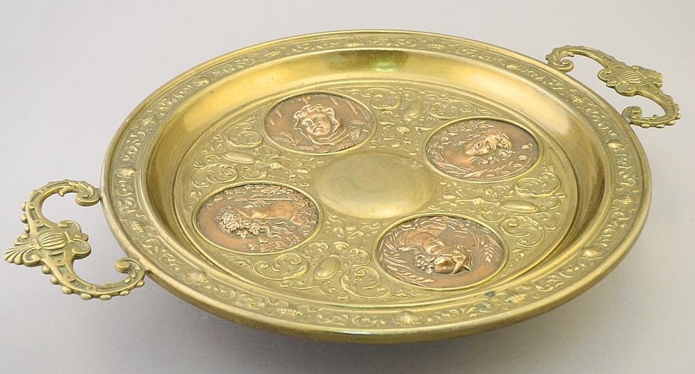 LOT 249 19th Century Brass Tazza inset of Copper Portrait Rondels, 2 3/8 x 14 x 10 1/4". Estimate: $60 - $100 Auction Date: Tuesday, August 15 2023 at 4:00 PM