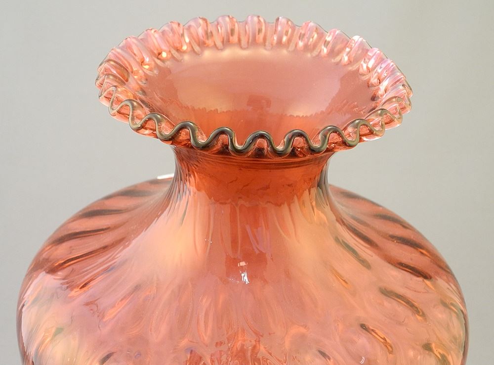 Fenton Cranberry Glass Vase, Coin Dot, Crimped Top, 11"H.