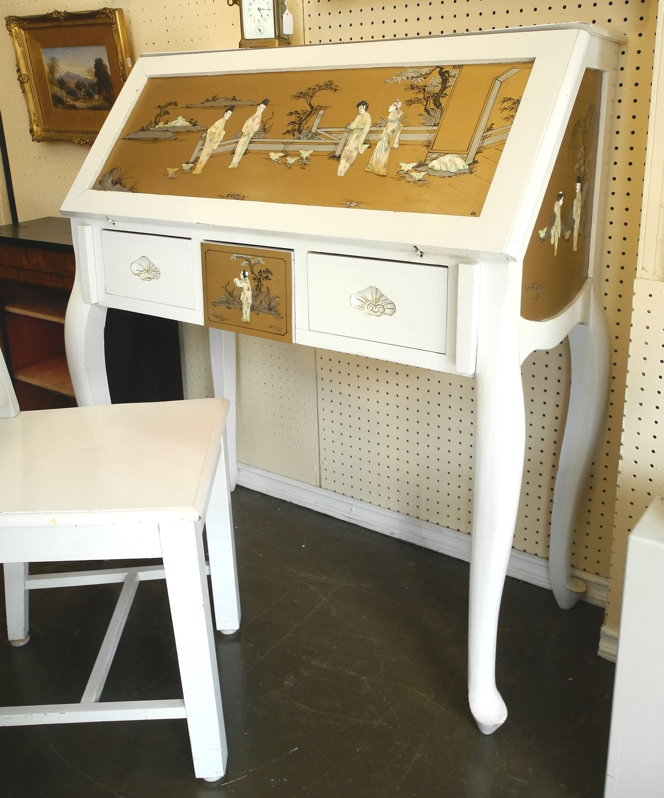 White Painted Chinoiserie Bureau Inset with Mother of Pearl With Chair.