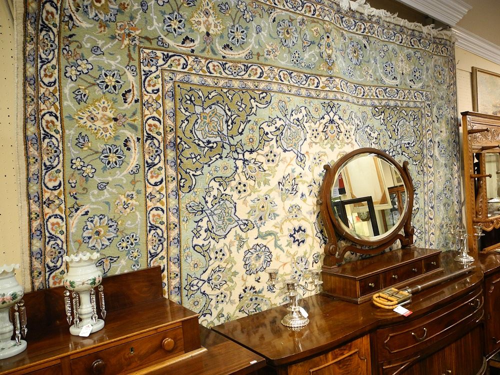 Hand Knotted Wool Carpet, White and Blue, approx. 9'4" x 13'.