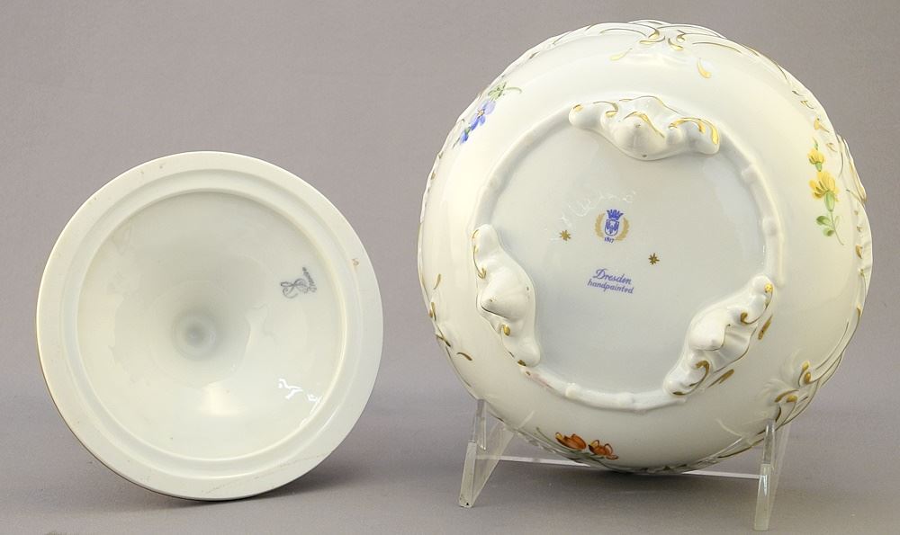 Dresden Candle Sticks (3 3/4"), Bowl with Lid, Oval Bowl, Handled Bowl, Lattice Footed Bowl.