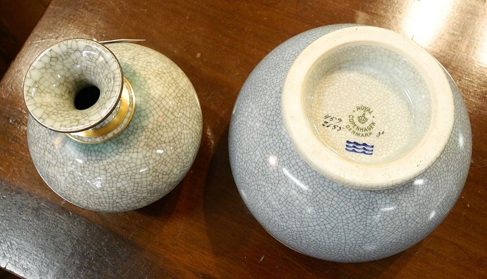 LOT 230 2 pcs of Royal Copenhagen Craquelure Porcelain: Vase (4"H) and Bowl (5 1/4" diam). Estimate: $100 - $150 Auction Date: Tuesday, August 15 2023 at 4:00 PM