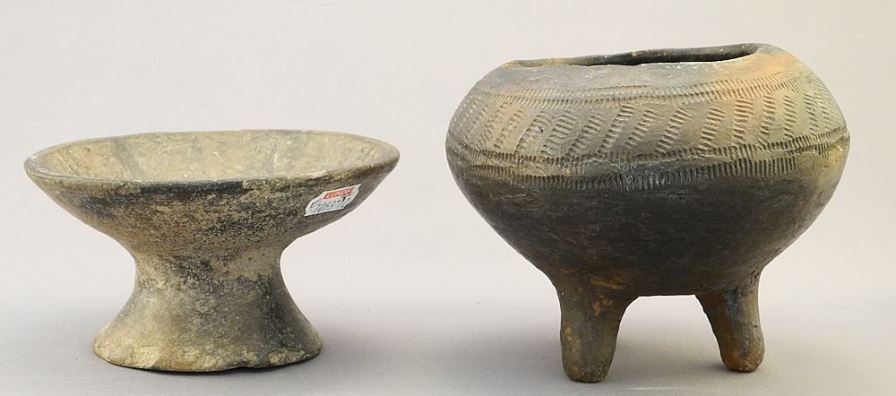 LOT 233 3 pcs of Pre-Columbian Pottery: Figural / Tripod / Sun Mohr, restoration noted, 2 3/4 - Estimate: $150 - $300 Auction Date: Tuesday, August 15 2023 at 4:00 PM