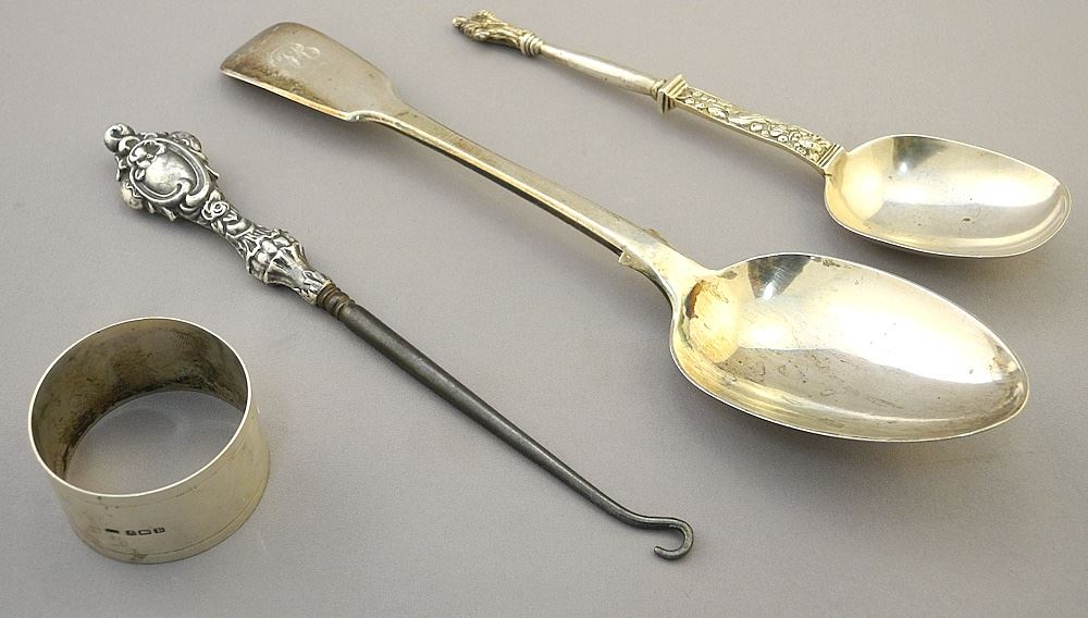 2 Hallmarked Silver Spoons with Napkin Ring and Hook, TW 160 grams.
