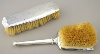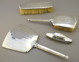 LOT 63 4 Sterling Silver (marked) Dresser pieces: Mirror (11 1/2"L) / Buffer / 2 Brushes. Estimate: $100 - $200 Auction Date: Tuesday, August 15 2023 at 4:00 PM