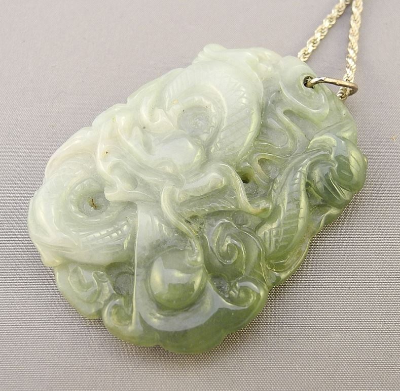 Chinese Jade "Dragon" Pendant (2"H) on 925 (marked) Silver Chain (28"L).