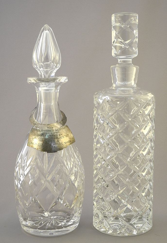 4 Crystal Decanters (10 1/4 - 12 1/4"H), One with Silver Gorgette.