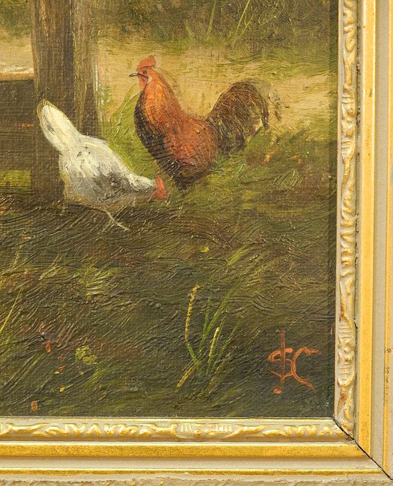 LOT 185 Oil on Canvas Monogrammed JSC, 13 1/2 x 11 1/4", "Farmhouse Scene with a Farrier". Estimate: $150 - $300 Sold For: $200 Auction Date: Tuesday, October 17 2023 at 4:00 PM