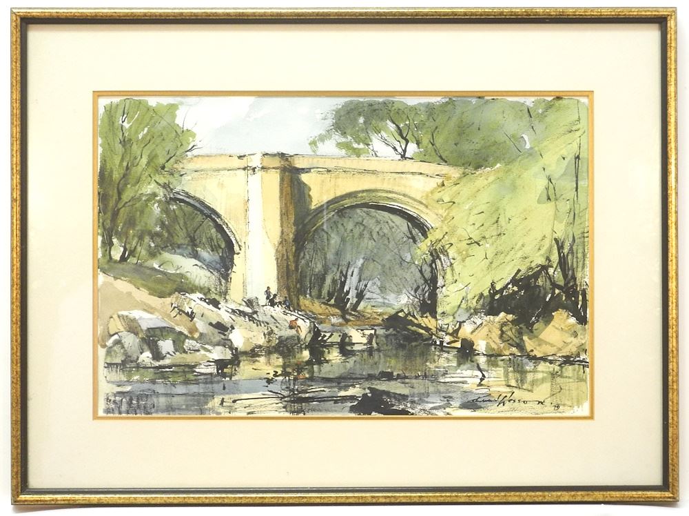 LOT 92 Watercolour Signed Edward Wesson, 12 7/8" x 20", "Swimming Under Train Bridge". Estimate: $60 - $100 Sold For: $180 Auction Date: Tuesday, October 17 2023 at 4:00 PM