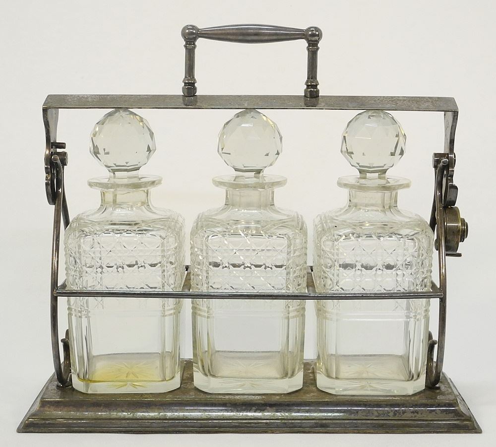 Silver Plated Tantalus, Chipped Decanters, 15 3/4".