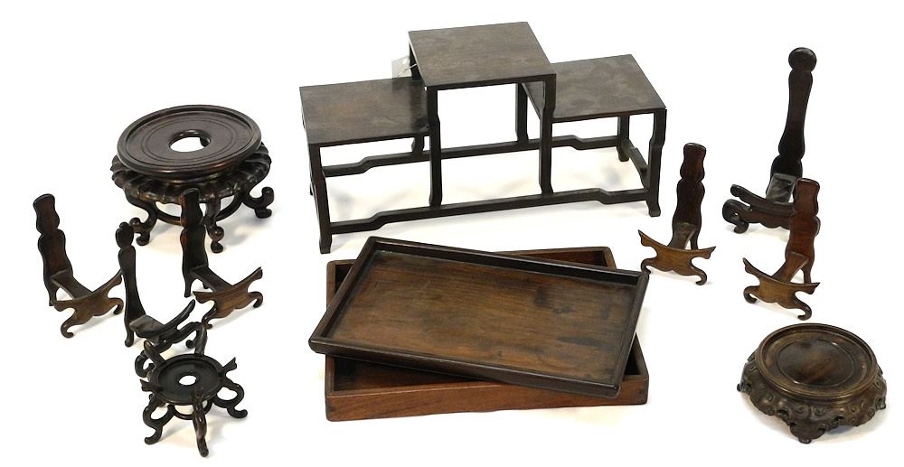 Collection of Chinese Stands & Two Trays, 2 1/8" - 15 3/8"W.