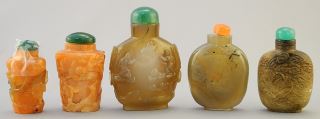 LOT 60 5 Chinese Agate Snuff Bottles, 1 3/4" - 2 1/2" High Estimate: $150 - $200 Sold For: $100 Auction Date: Tuesday, October 17 2023 at 4:00 PM