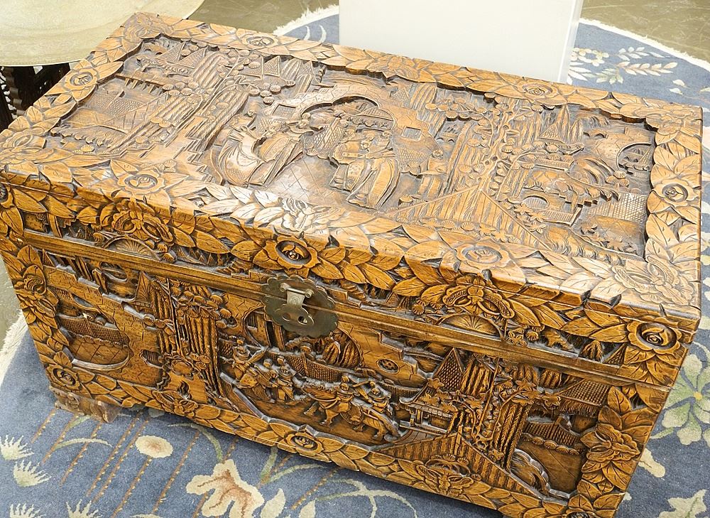 Deep Carved Camphor Wood Chest, 25 3/8" x 46" x 21 3/4".