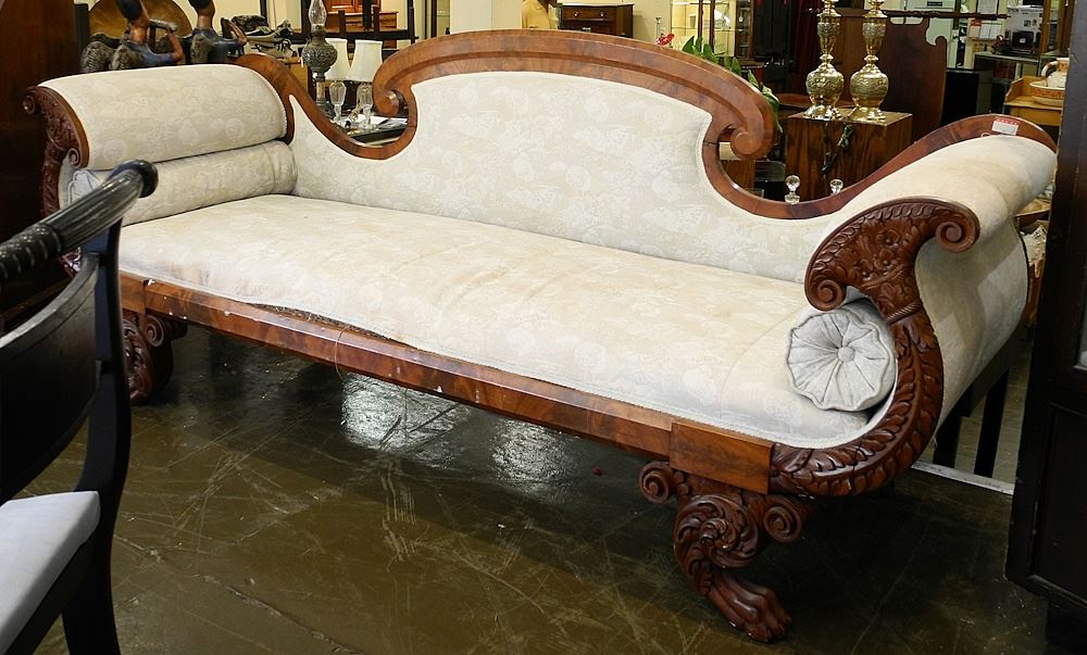 LOT 30 Bateau Shaped Carved Paw Foot Sofa, 19th Century, Approximately 85"L. Estimate: $100 - $300 Sold For: $250 Auction Date: Tuesday, October 17 2023 at 4:00 PM