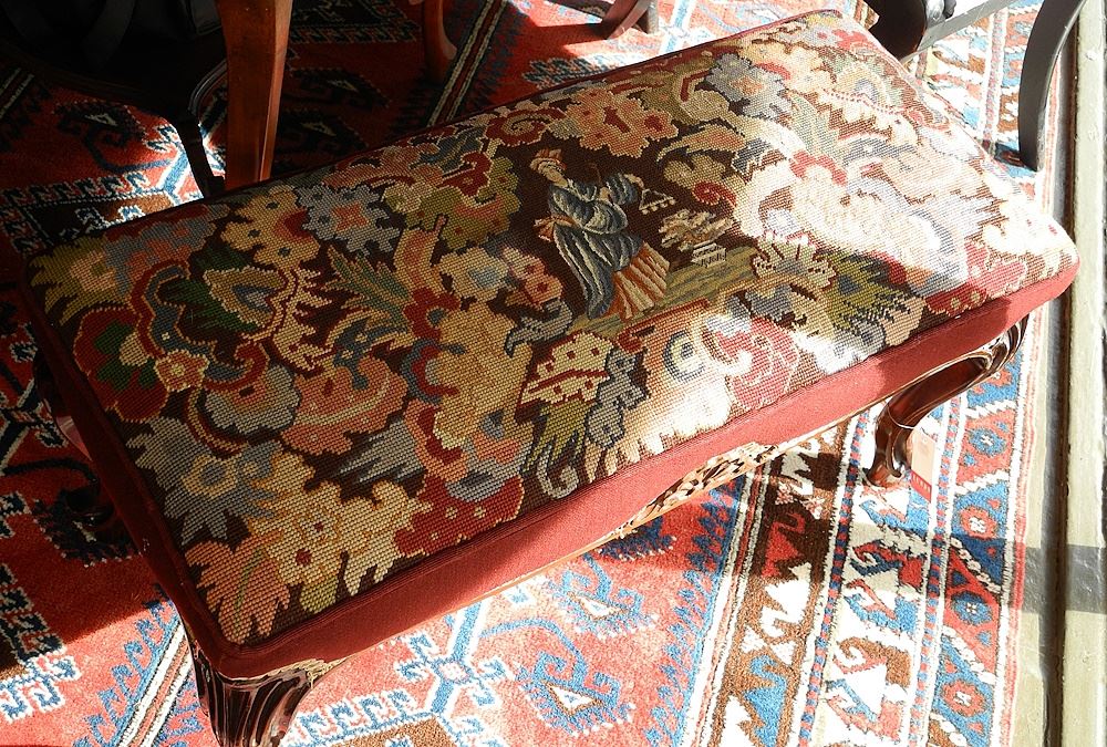 LOT 3 Gloss Mahogany Cabriole Leg Needlepointed Footstool, 16 1/2" x 32" x 14 1/4". Estimate: $80 - $140 Auction Date: Tuesday, October 17 2023 at 4:00 PM