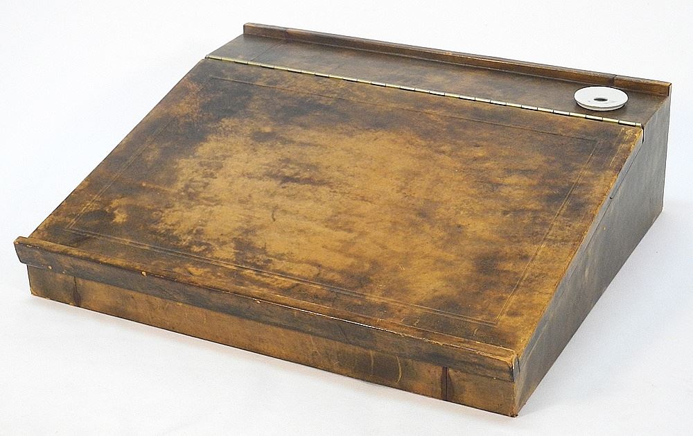LOT 215 Contemporary Leather Writing Slope with Porcelain Inkwell, 5 1/8" x 17 3/4" x 15 1/4". Estimate: $80 - $120 Sold For: $20 Auction Date: Tuesday, October 17 2023 at 4:00 PM