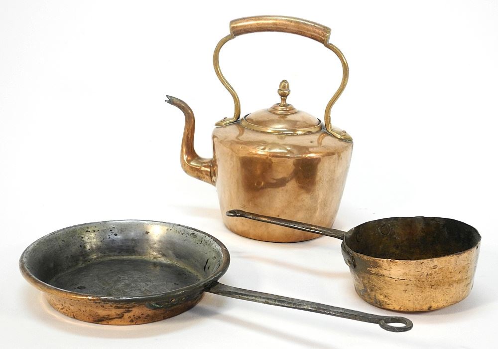 19th Century Copper Kettle & 2 Pans, 10-17" L.