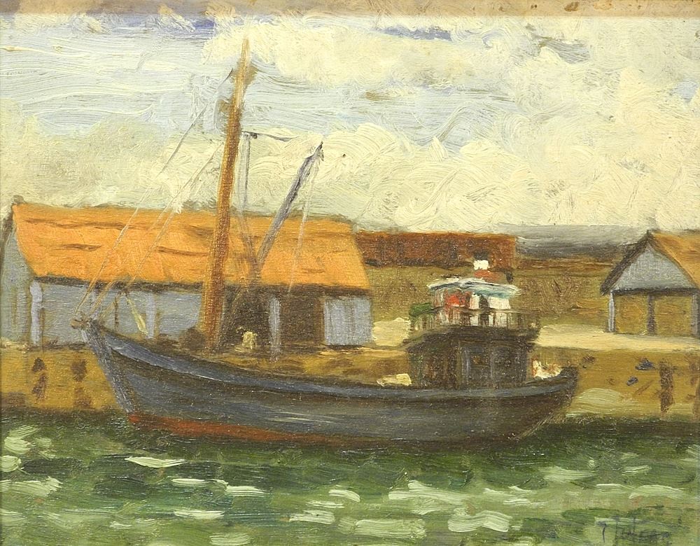 Oil on Board signed Indistinctly, 5 3/4 x 7 1/2", "Fishing Boat at Harbour".