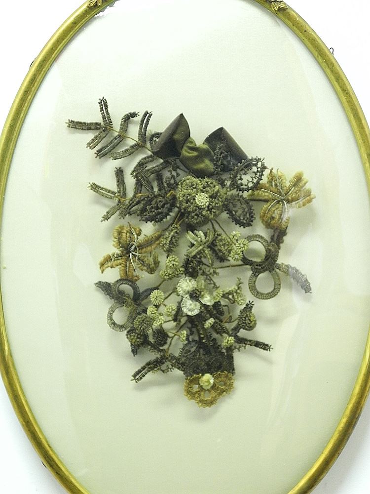19th C. Hair Art Bouquet in Convex Glass Frame, 23" x 15 1/2" x 1 1/4".