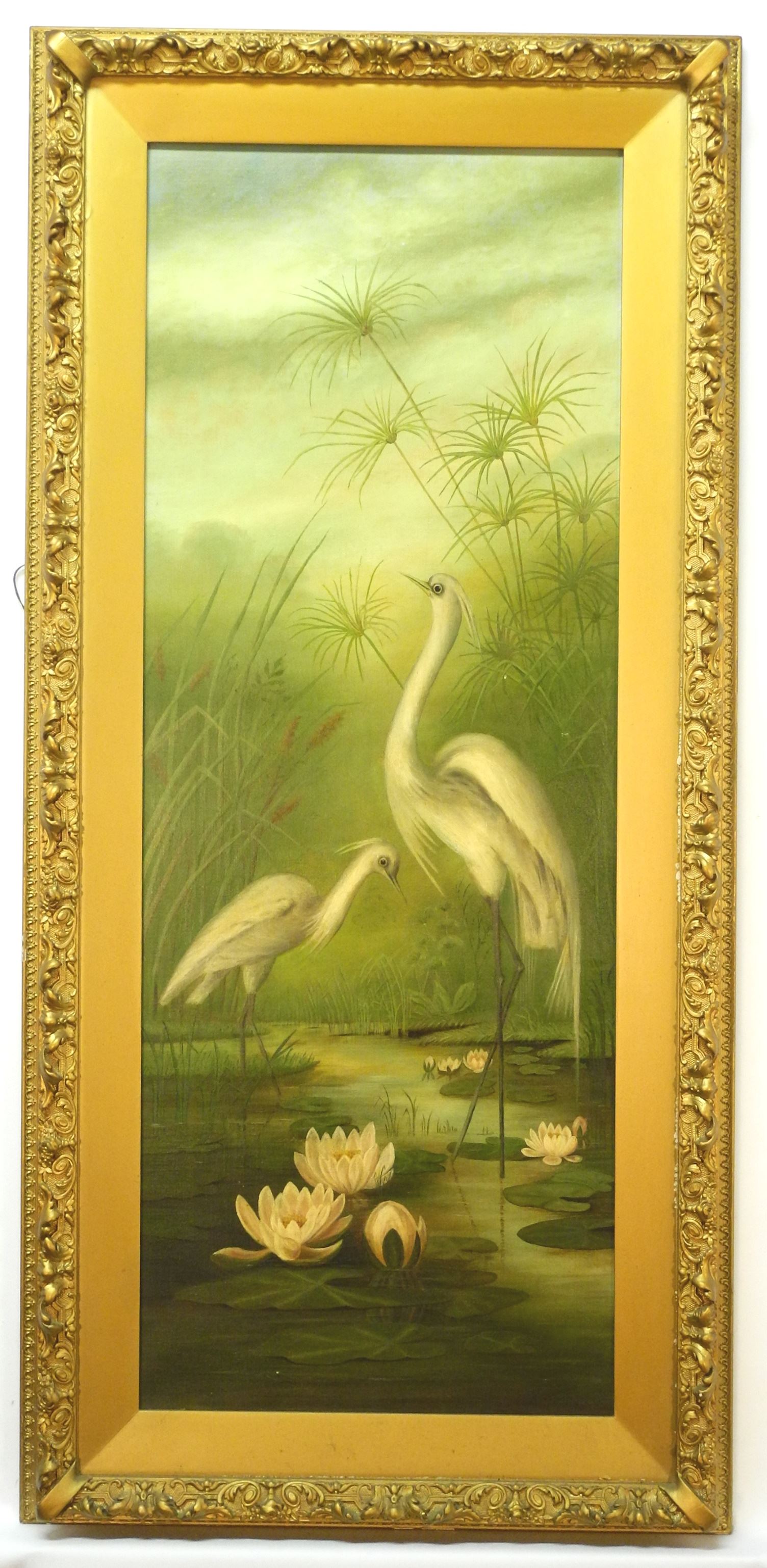 LOT 184 19th C. Oil on Canvas, 36 1/2" x 13 5/8", "Exotic Birds & Lotus Blossoms". Estimate: $100 - $150 Sold For: $200 Auction Date: Tuesday, January 16 2024 at 4:00 PM