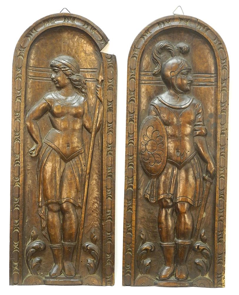 LOT 162 Pair of Swiss / Italian Carved Walnut Portrait Panels, 19 1/2" x 7 3/8" x 1/2" (loss noted) Estimate: $80 - $100 Sold For: $110 Auction Date: Tuesday, January 16 2024 at 4:00 PM