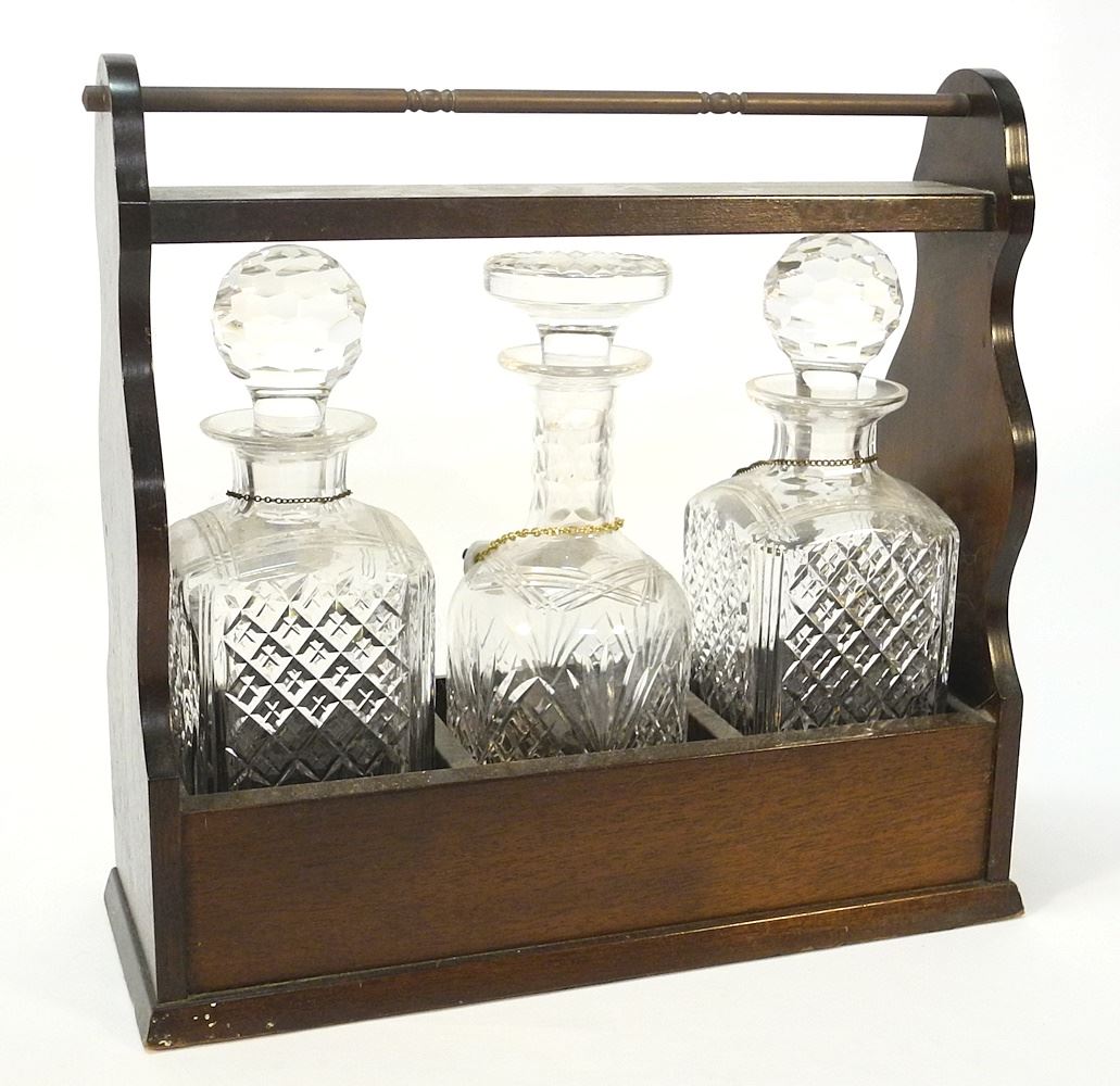 LOT 64 Mahogany 3 Bottle Tantalus with Key & Labels, 1 Bottle Replaced, 15"W. Estimate: $60 - $100 Sold For: $70 Auction Date: Tuesday, January 16 2024 at 4:00 PM