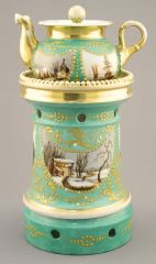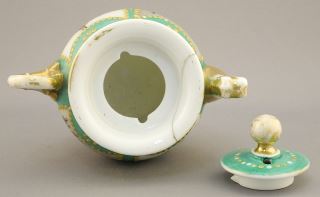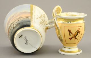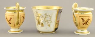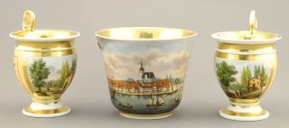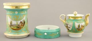 Russian Porcelain Tea Pot Warmer (9 1/8") & 3 Cups (restoration noted).