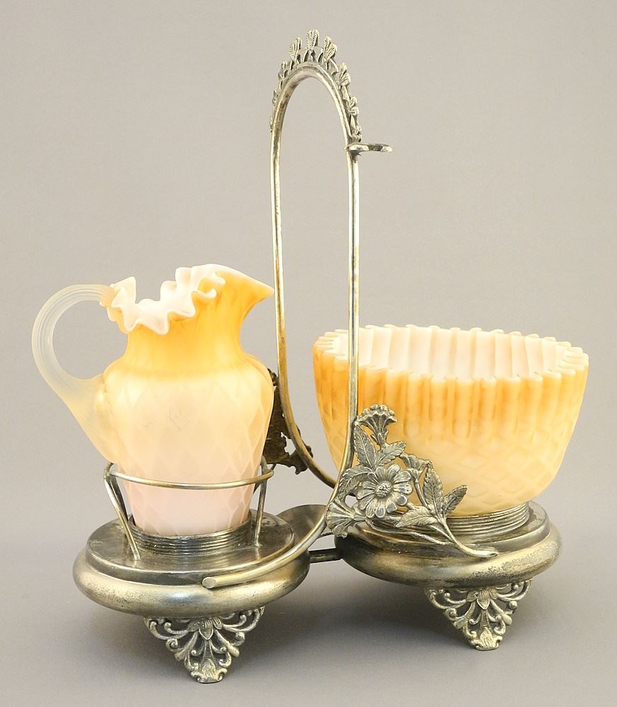 2 Silver Plate & Quilted Glass Items Bridal Basket (11 1/4"W) & Cream & Sugar.