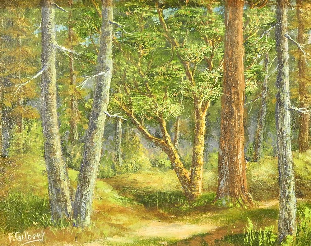 Oil on Masonite signed F. Gilbert, 7 1/2 x 9 3/8", Untitled Forest Glade.