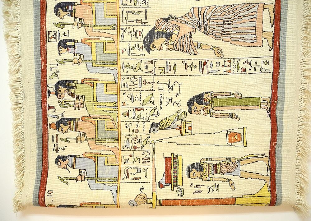 LOT 47 Egyptian Silk Hieroglyphic Mat Approximately 4'2" x 2'3". Estimate: $250 - $350 Sold For: $150 Auction Date: Tuesday, January 16 2024 at 4:00 PM