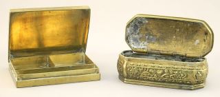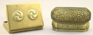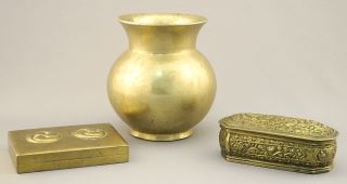 LOT 221 3 Brass Items: Betel Nut Box / Stamp Box / Vase, 3/4" - 4 3/4"H. Estimate: $50 - $60 Sold For: $60 Auction Date: Tuesday, January 16 2024 at 4:00 PM