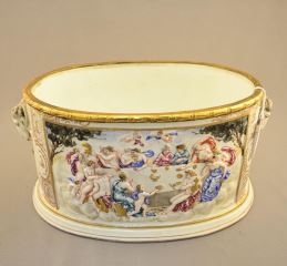 19th C. Capodimante Porcelain Jardiniere with Ram Handles, 4 7/8" x 10 3/8" x 6 7/8".