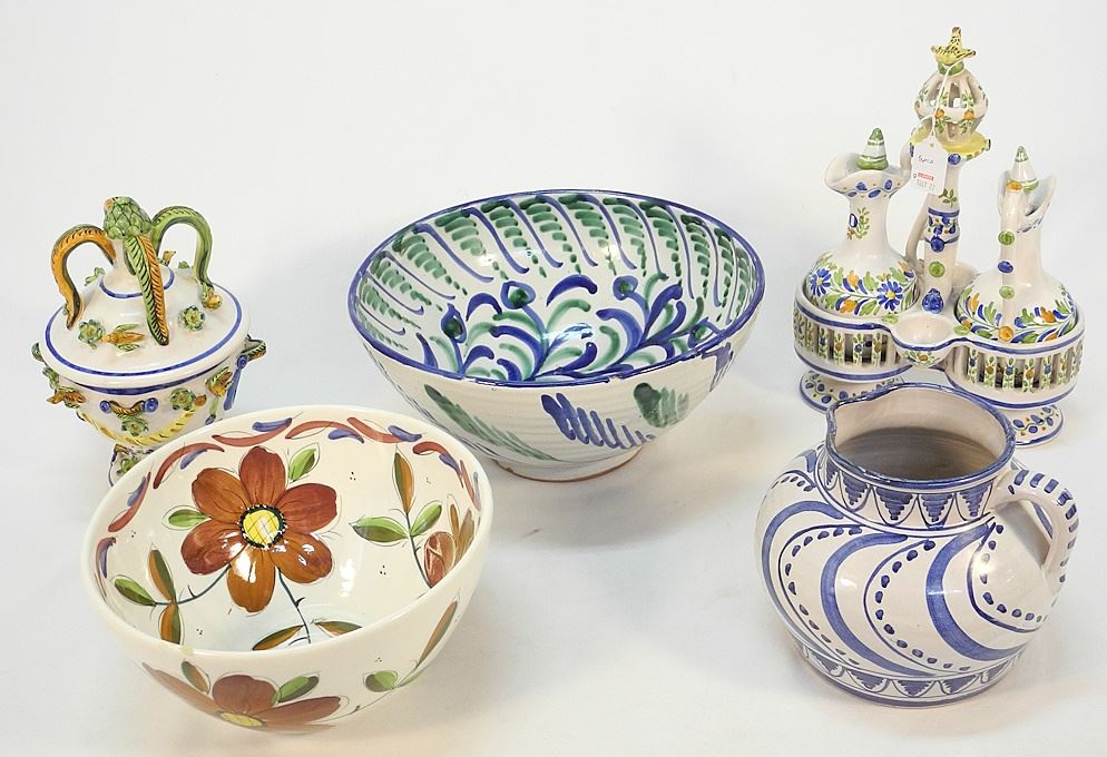 5 Pieces of Various Spanish Pottery: Cruet Set / Covered Bowl / 3 Bowls, 5 1/8 - 13"H.