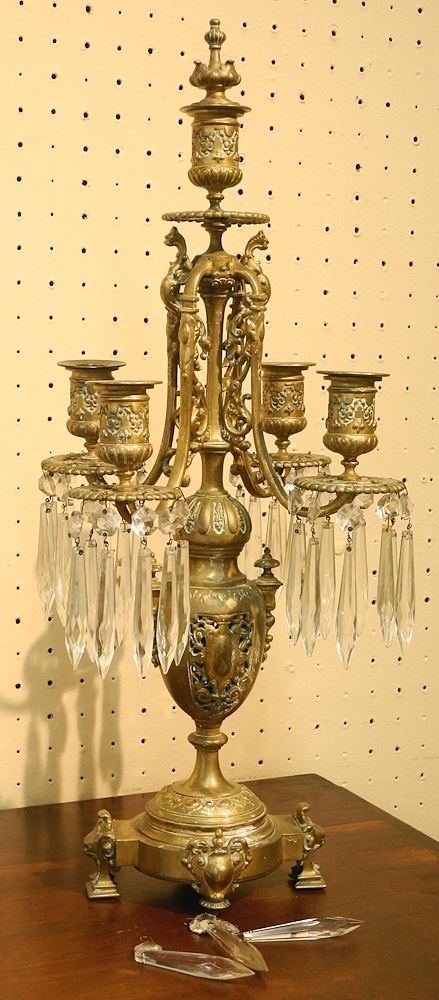 Pair of 19th Century Brass & Crystal Candelabra, 21"H.