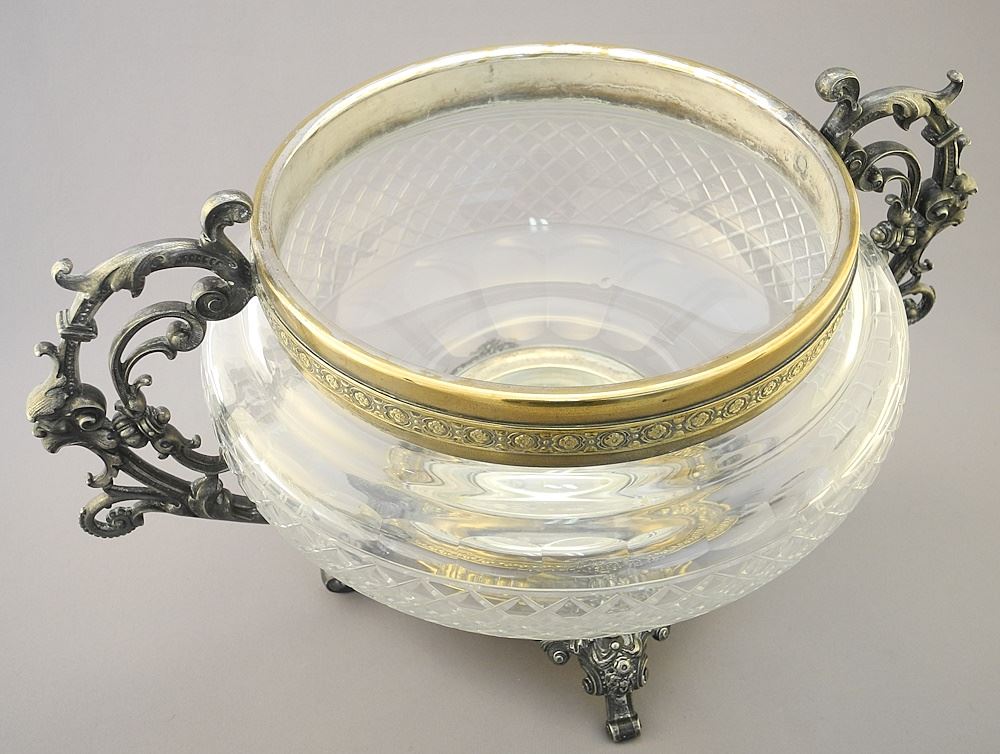 German WMF (signed on base) Rococco Repousse Silver Plate Crystal & Brass Punch Bowl, 16 x 14
